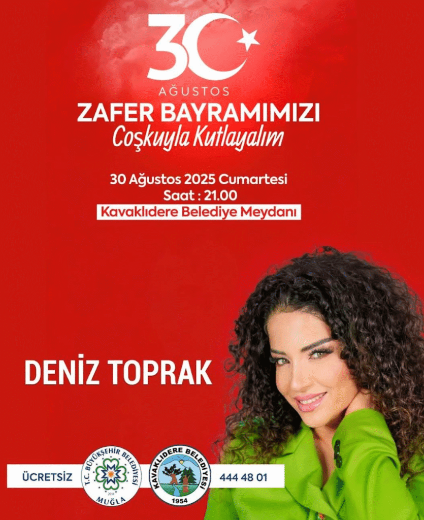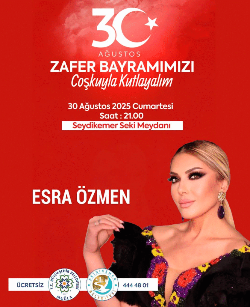 Türkiye Cumhuriyeti’nin kurucusu Gazi Mustafa Kemal Atatürk önderliğinde, Türk Milleti’nin azmi, kararlılığı ve fedakârlığı ile kazanılan 30 Ağustos Başkomutanlık Meydan Muharebesi’nin 103.yılı Muğla’da çeşitli konserler ve söyleşilerle kutlanacak. Büyükşehir Belediyesi 30 Ağustos Zafer Bayramı’nda Muğla’nın 3 ilçesinde konserler düzenleyecek. Menteşe Cumhuriyet Meydanı’nda Can Bonomo sevenleri ile buluşurken Seydikemer Seki Meydanı’nda Esra Özmen, Kavaklıdere Belediye Meydanı’nda da Deniz Toprak konserleri vatandaşla buluşacak.