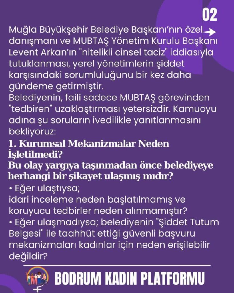 Bodrum Kadın Platformu, Levent Arkan’ın kamuoyuna yansıyan taciz iddialarına karşı  Muğla Büyükşehir Belediyesi’ne çağrıda bulunarak “Şiddet Tutum Belgesi”nin hayata geçirilmesini istedi. Platform, belediyenin şiddetle mücadele konusundaki yaklaşımını eleştirerek somut adım atılması gerektiğini vurguladı.