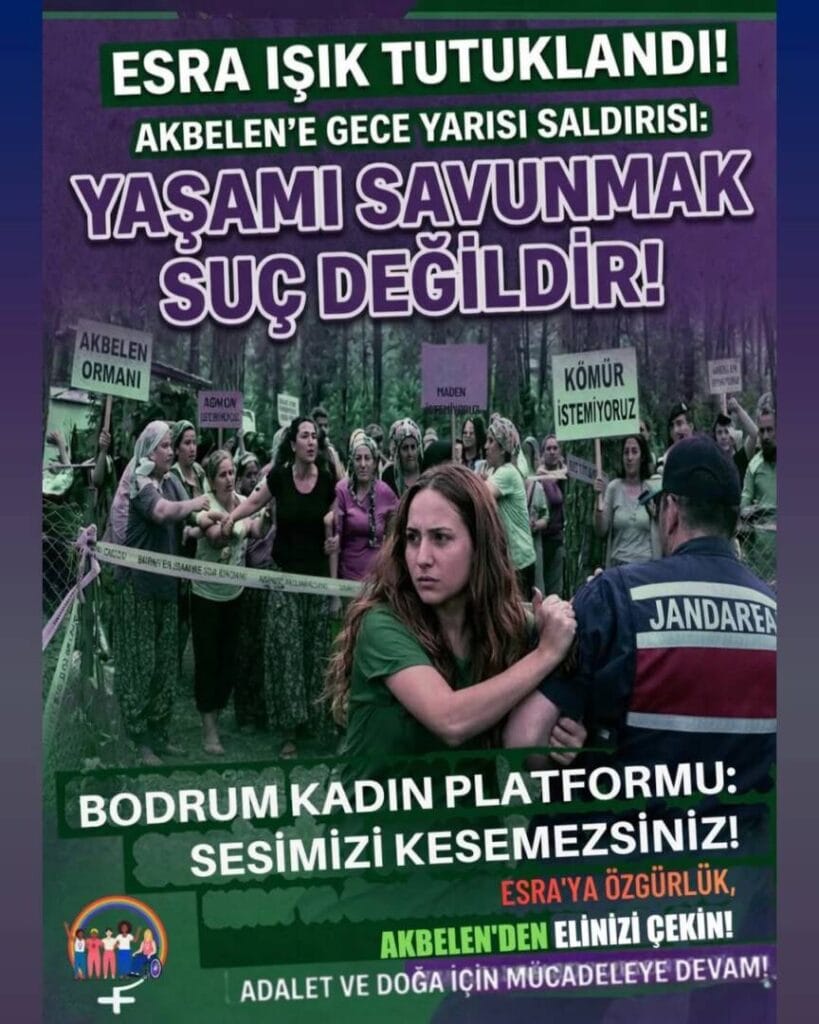 Bodrum Kadın Platformu, Esra Işık’ın tutuklanmasını yalnızca bireysel bir olay olarak değil, doğa mücadelesi verenlere yönelik bir gözdağı olarak değerlendirdi. Açıklamada, kadınların ön saflarda yer aldığı Akbelen direnişinin hedef alındığına dikkat çekildi.
