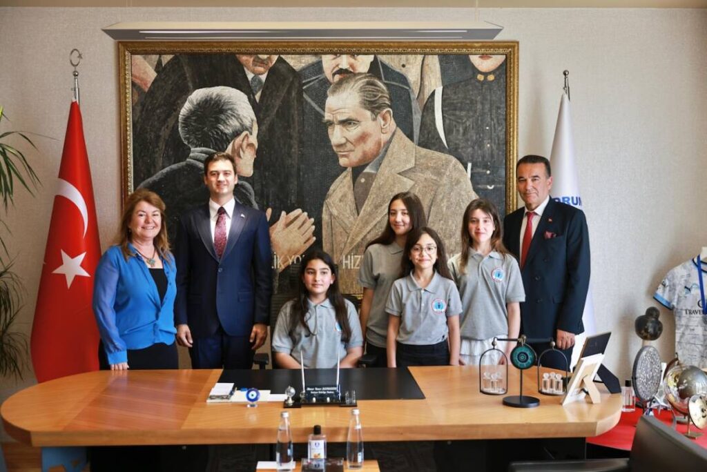 23 Nisan gelenekleri kapsamında Bodrum Belediye Başkanlığı makamı temsili olarak Vedat Türkmen Ortaokulu öğrencisi Zeynep Altınsayar’a devredildi. Arkadaşları Hüdanur Koçoğlu, Elif Huri Türk ve Elif Erdoğan ile birlikte Bodrum Belediye Başkanlığı görevini Başkan Tamer Mandalinci’den devralan Altınsayar, Bodrum’a dair hayallerini ve projelerini paylaştı. Ziyarette Vedat Türkmen Ortaokulu Müdürü Mehmet Ünal ve öğretmen Gönül Ay da öğrencilere eşlik etti.