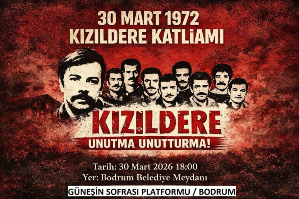 Bodrum’da Kızıldere Katliamının yıl dönümünde anma programı düzenlendi. Güneşin Sofrası Platformu çağrısıyla Bodrum Belediye Meydanı’nda gerçekleşen etkinlikte, 30 Mart 1972’de yaşamını yitiren isimler anıldı.